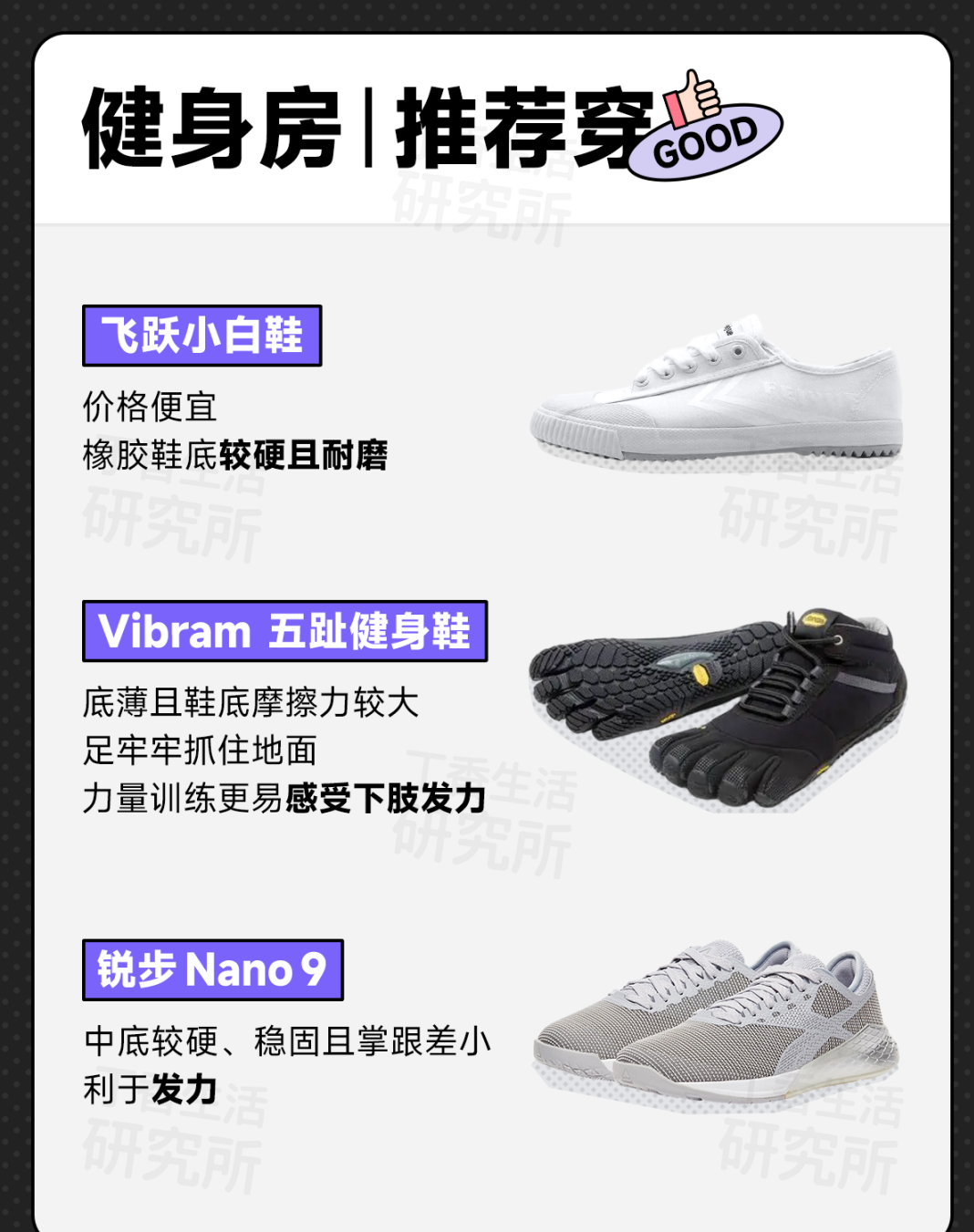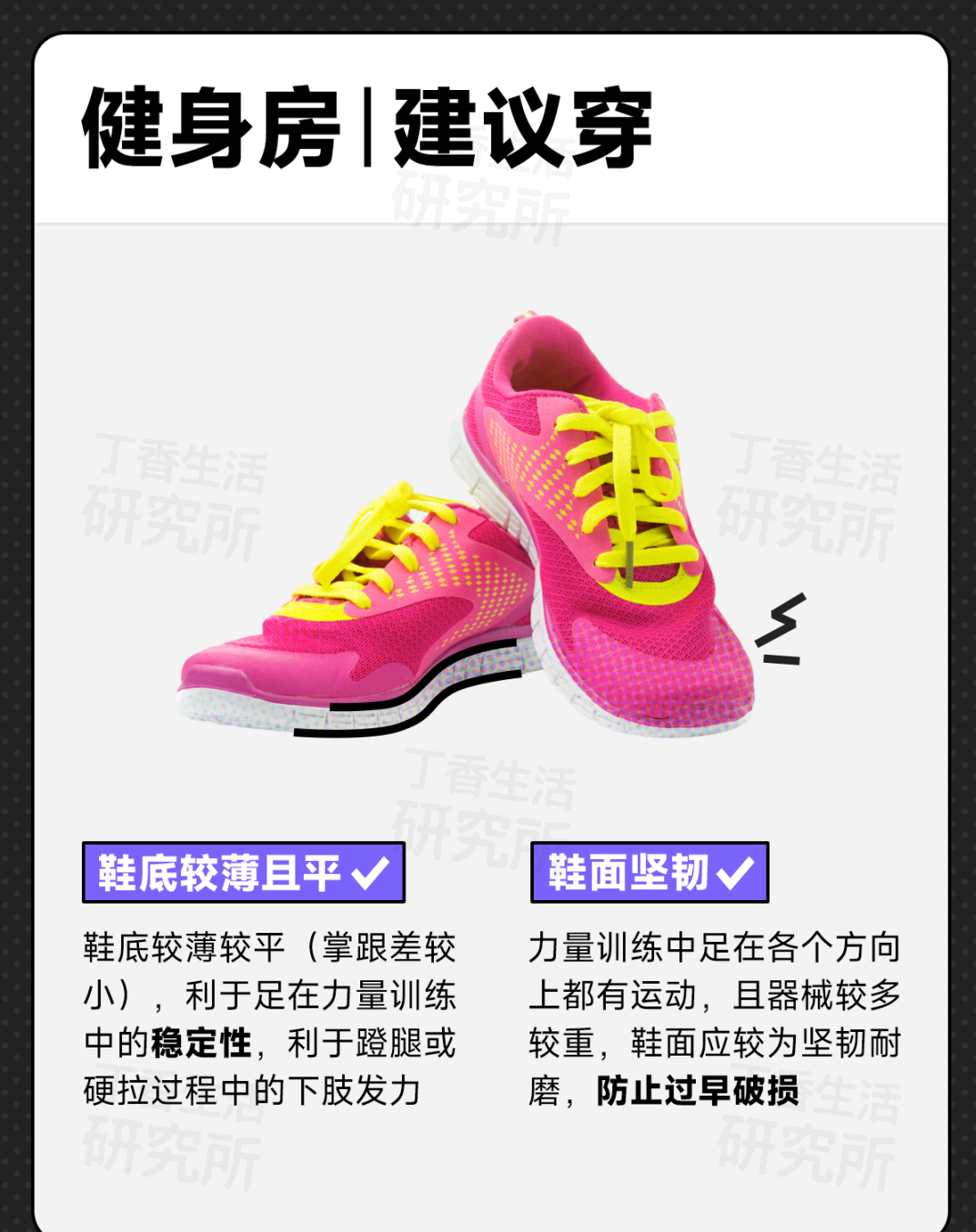 👉比如,一直穿跑步鞋去健身房的阿发我,才知道举铁不应该穿跑步鞋,最好应该是平底鞋(比如飞跃小白鞋);