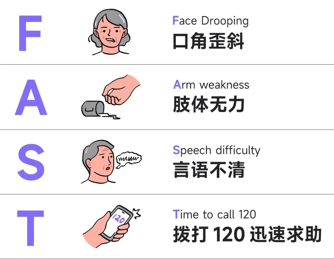 识别脑梗中风(脑卒中),请记住 FAST 原则👇