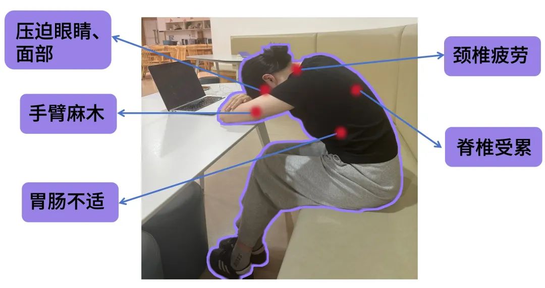 首先,让我们来用一张图说明,当你趴在桌子上午睡时,身体的各个部位都会遭受些什么: