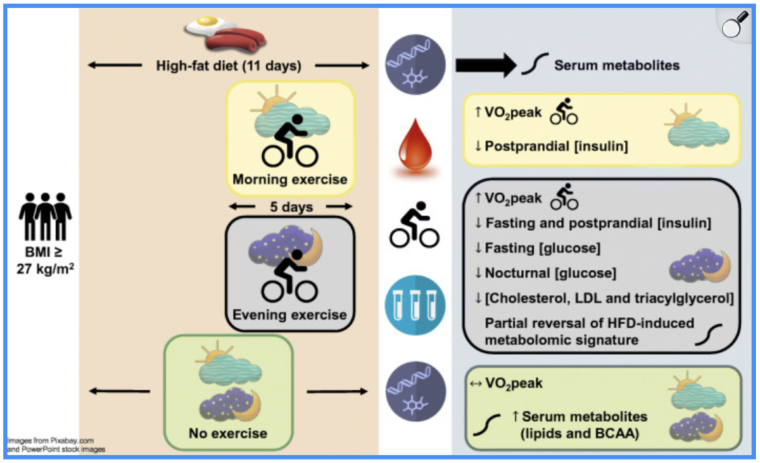 在连续 11 天的高脂肪饮食后,研究人员把 25 名超重/肥胖的志愿者分成了「早上 6 点半」运动组和「晚上 6 点半」运动组,观察他们身体的变化。[3]