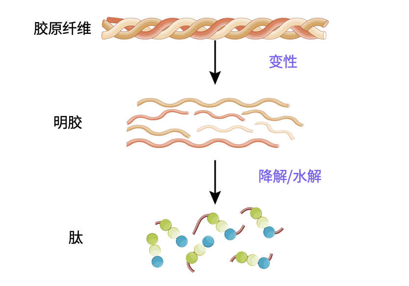 我们常说的猪蹄里的胶原蛋白是一类大分子蛋白,而胶原蛋白肽则是以富含胶原蛋白的新鲜动物组织为原料,经过提取、水解、精制生产的,相对分子量低于 10000 DA 的产品。[1]
