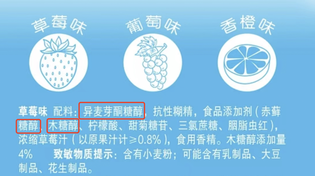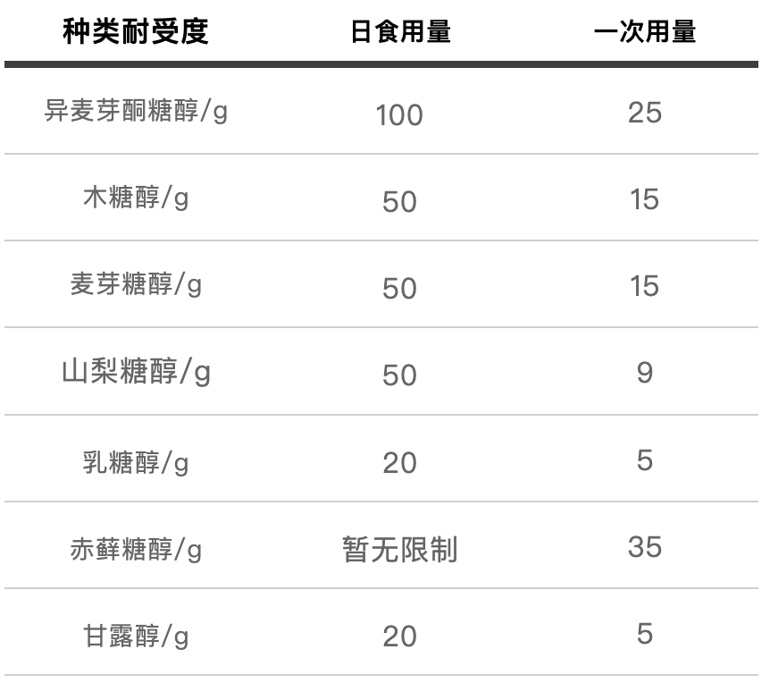 一方面,每个人对于糖醇的耐受量不同,更重要的是,能用作代糖的糖醇就有好几种,而每个人敏感的糖醇类型可能还不一样。