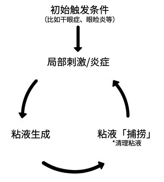 眼表细胞会因刺激而产生过量粘液。当患者从眼表「捕捞」过量粘液时,「滚雪球」循环便开始了,从而导致更严重的粘液排出。治疗的重点在于消除诱发因素,并告知患者在排出过量粘液时不要触摸眼睛。