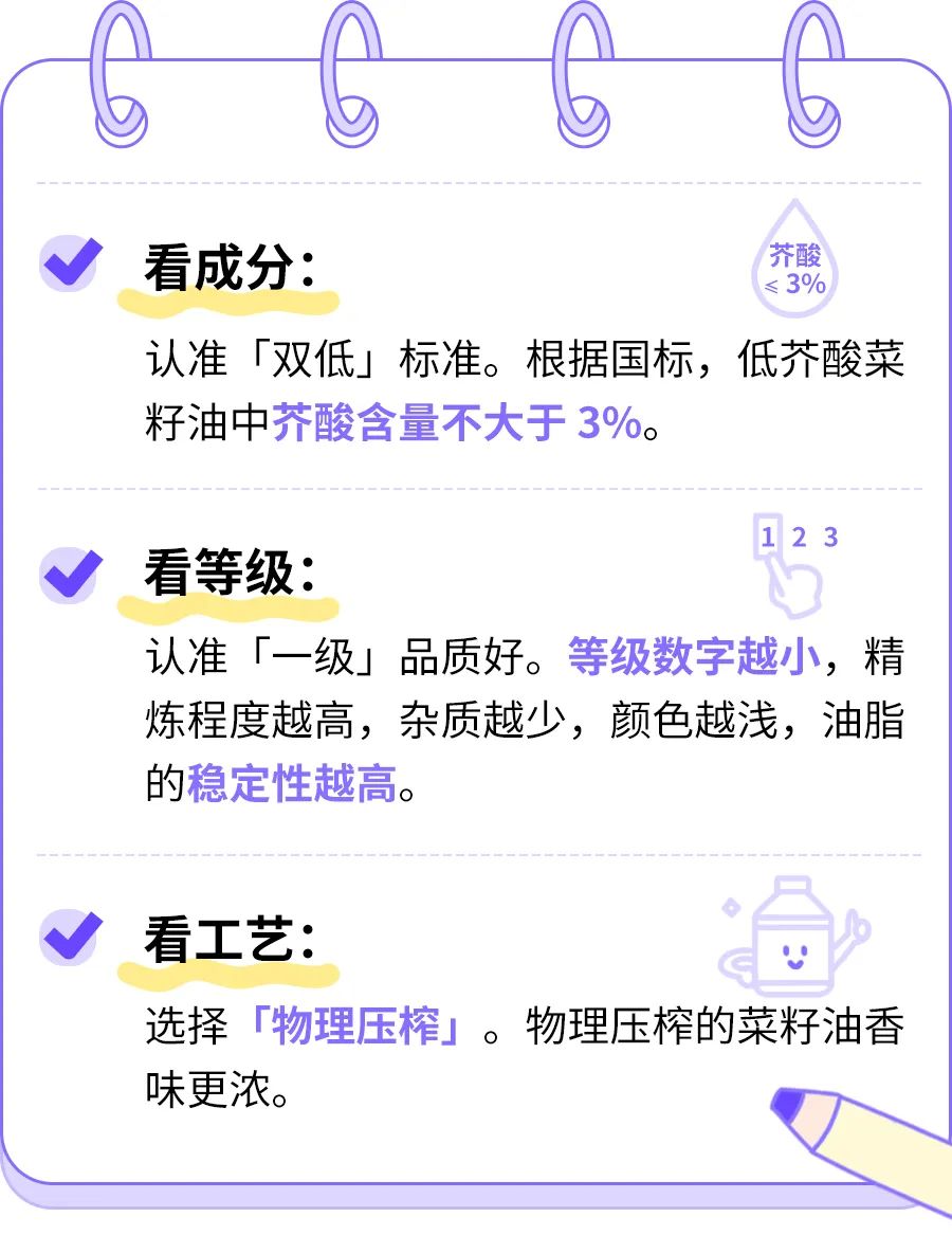 对了,菜籽油虽好,可别独宠它一个!油还是要换着吃,脂肪酸摄入才会更加均衡。