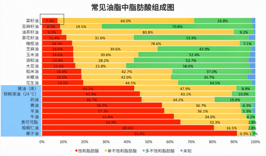 菜籽油在这方面就比较有优势了,饱和脂肪酸比例仅有 7.3%,在常见的植物油中是最低的,比橄榄油(14.1%)还低!