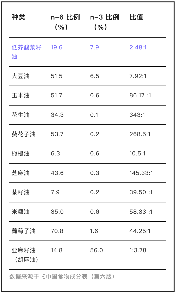 菜籽油有利于降低膳食中 n-6 的比例,考虑到目前大家 n-3 脂肪酸摄入不足,还是一个不错的 n-3 脂肪酸来源。