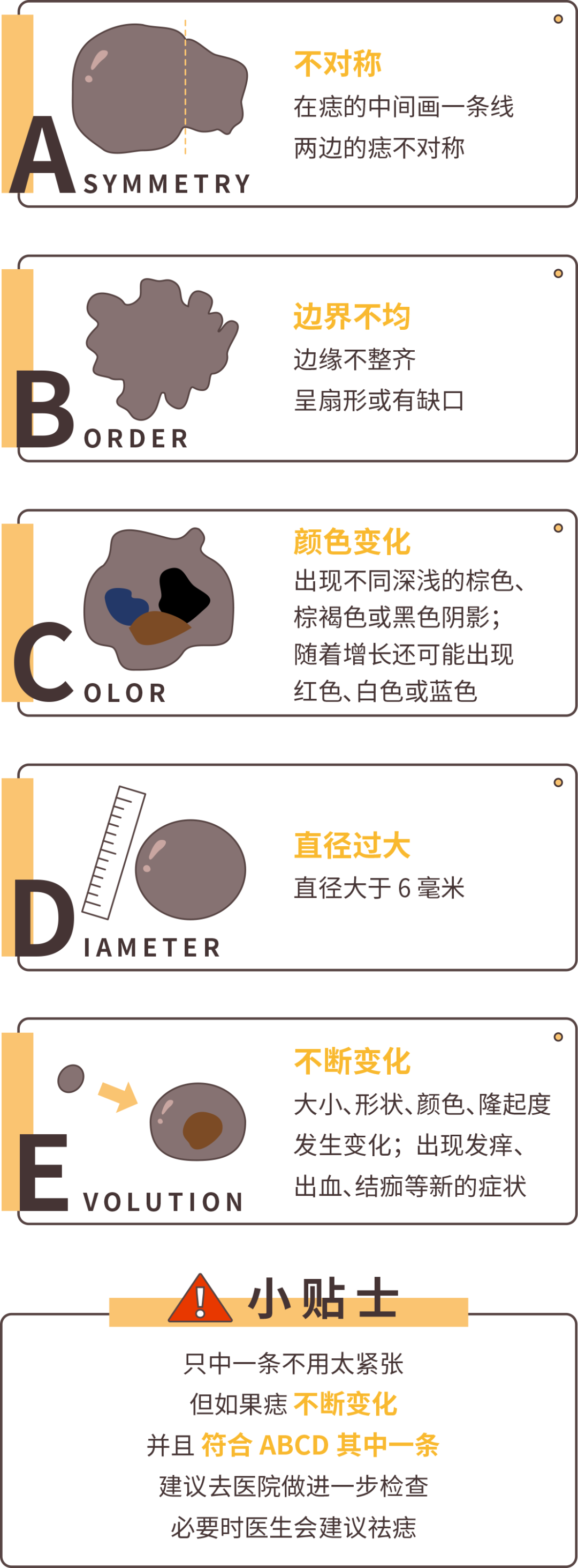 另外总结上文的 ABCDE+丑小鸭法则:关注不对称 (A)、边缘 (B)、颜色 (C)、直径>6 mm (D)、演变 (E) 以及「看上去和其它痣不同」的那一颗。