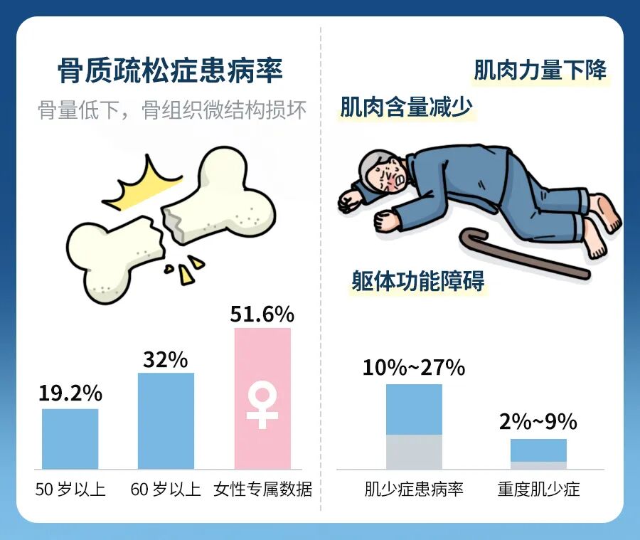 这两种情况,医学上分别叫骨质疏松症和肌少症,在老人中很普遍——