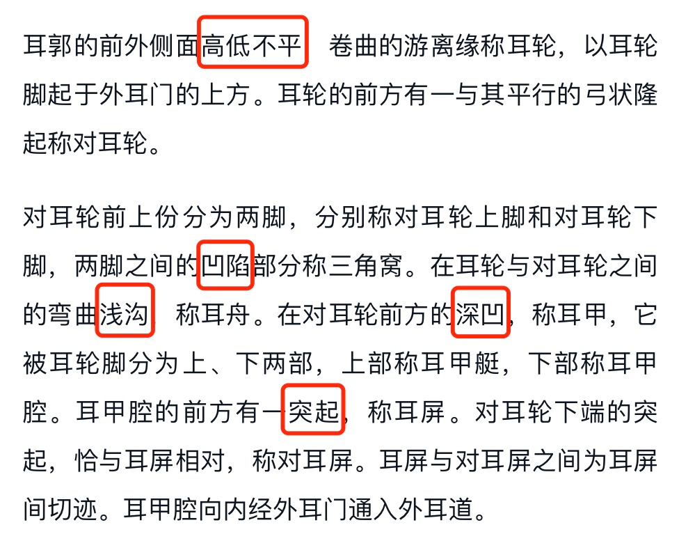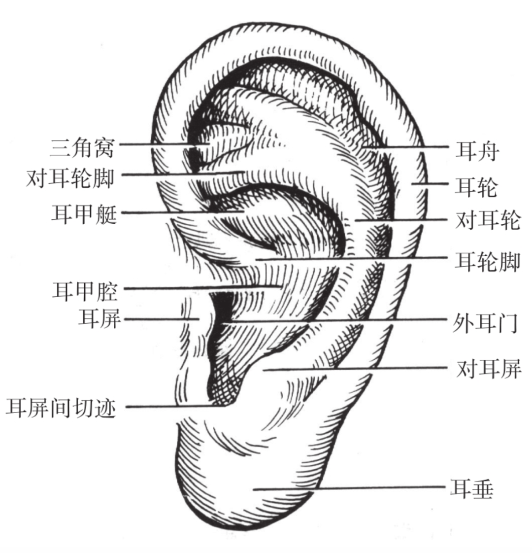 耳廓大部分以弹性软骨(脆骨)为支架,外覆皮肤,皮下组织甚少,是身上真正「皮包骨」的地方。少了肉的填充,崎岖的骨头走势便一览无余。