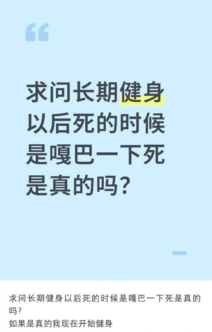 最近也流行起来一个说法:健身的真正好处,不仅是减脂增肌、延年益寿,而是死的时候,可以嘎嘣一下干脆利落。