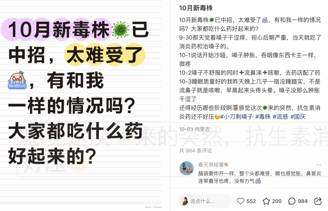 进入 10 月以来,不少人在社交平台上发帖说,自己出现了流感相关症状:咳嗽、发烧、头晕、嗓子疼……
