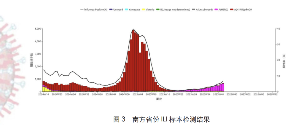 2025 年第 42 周,南方省份检测到 663 份流感病毒阳性标本。其中 32 份为A(H1N1)pdm09,593份为 A(H3N2),38 份为 B(Victoria)。