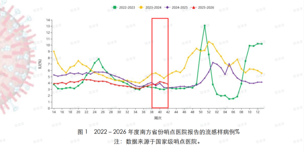 ● 南方省份哨点医院报告的流感样病例百分比为 3.8%,低于前一周水平(4.1%),高于 2022 年和 2024 年同期水平(3.2% 和 3.3%),低于 2023 年同期水平(5.3%)。
