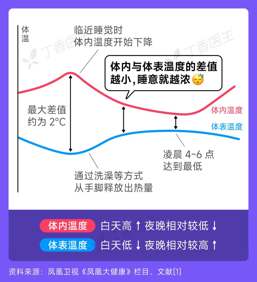 躯干、心脏等温度,叫体内温度,也叫核心温度,手臂、脚等温度,叫体表温度。身体是有昼夜节律的,一到晚上,身体会降低核心温度,缩小「体内 — 体表温差度」来帮助入睡。