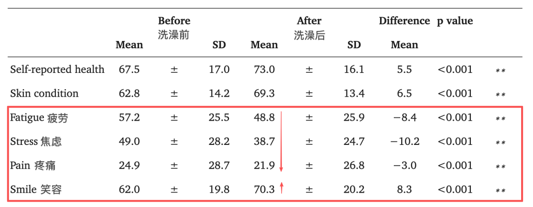 一项来自日本的横断面研究发现,每天用热水洗澡的人主观健康状况良好,睡眠和休息充足,压力水平低,主观幸福感高。泡澡能让疲劳、压力和疼痛的评分进一步大大降低。[7]
