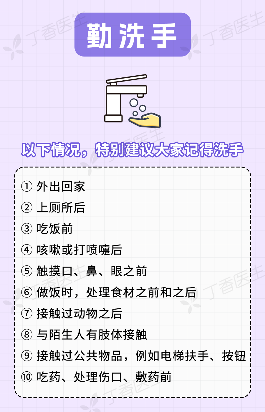 我们很难控制一天里会摸到多少东西、遇见多少病菌,最实际简单的办法,就是在这些关键节点把手认真洗干净: