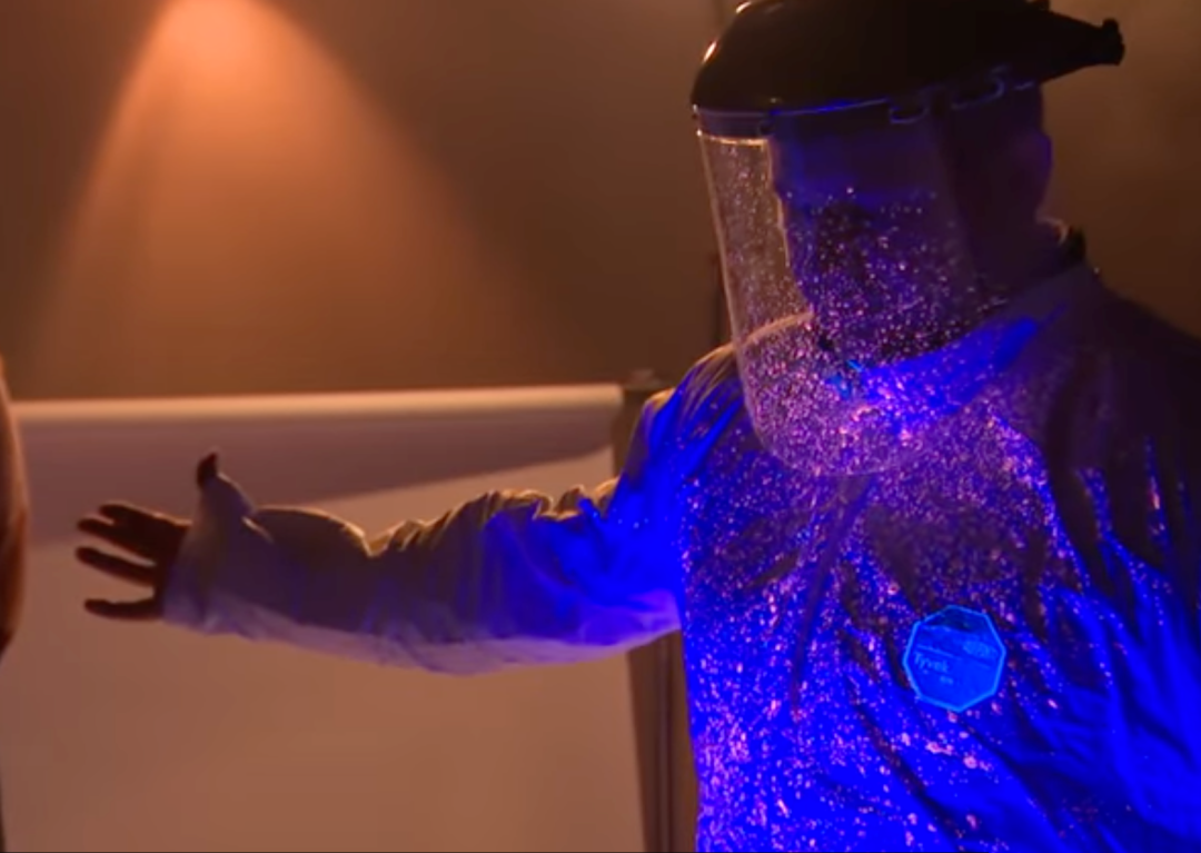 一户七口之家(夫妇、两儿两女和奶奶),先在爸爸手上喷了特殊荧光染料,模拟他「带着流感病毒回家」。