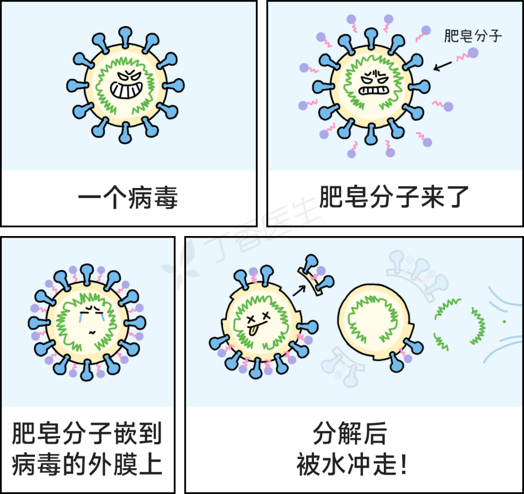 肥皂分子一头亲水,一头亲脂。亲脂端遇到病原体,会像小楔子一样插进病原体的脂质膜,把它们的外壳拆掉,病原体就被「肢解」了。