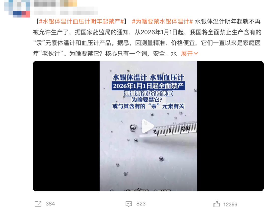 该《通知》明确指出,自 2026 年 1 月 1 日起,禁止生产含汞体温计和含汞血压计。