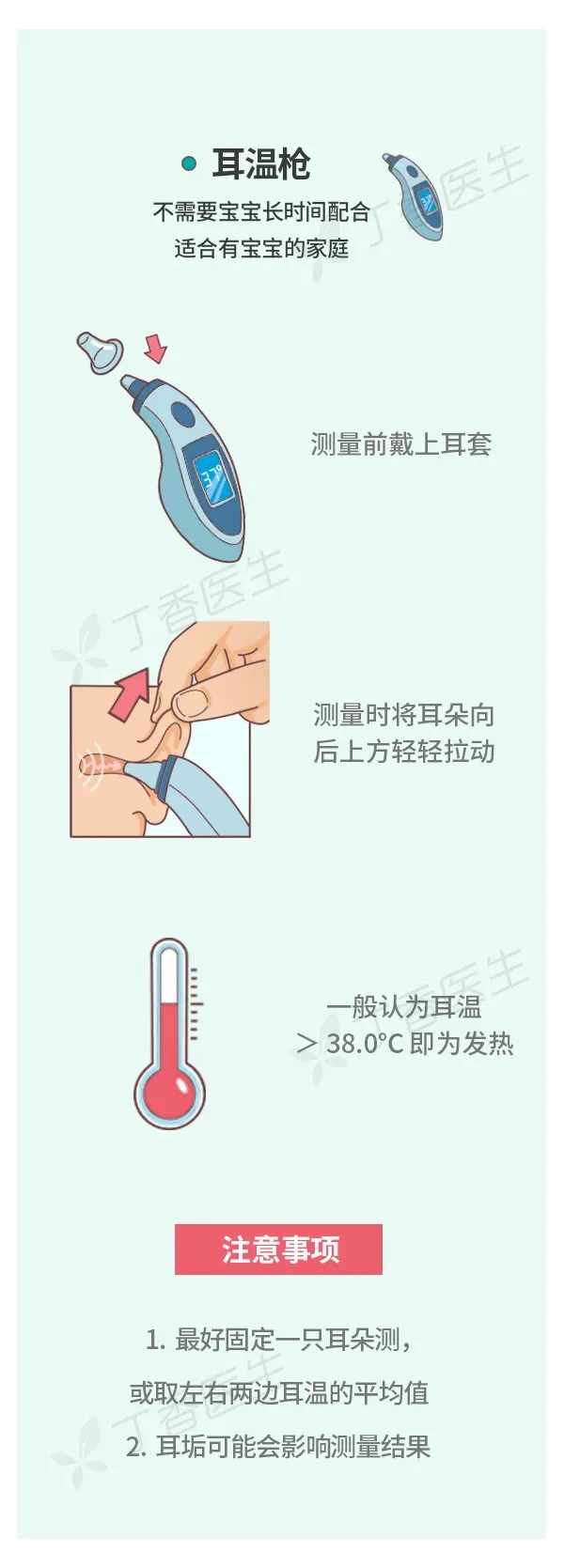 ● 测量方法不准确,也会影响结果。比如,腋窝没夹紧、耳道角度不对、额头出汗、婴儿血流分布不稳定、环境温度干扰等都会影响测量结果。