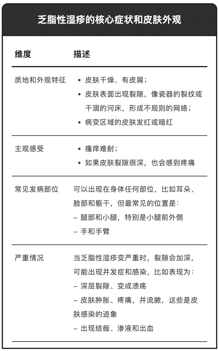 总之,如果在秋冬这种干燥季节,你的皮肤不仅干,还痒、红、起皮甚至有裂口,那基本就是它没跑了,为了它跑医院挂号的也不在少数——