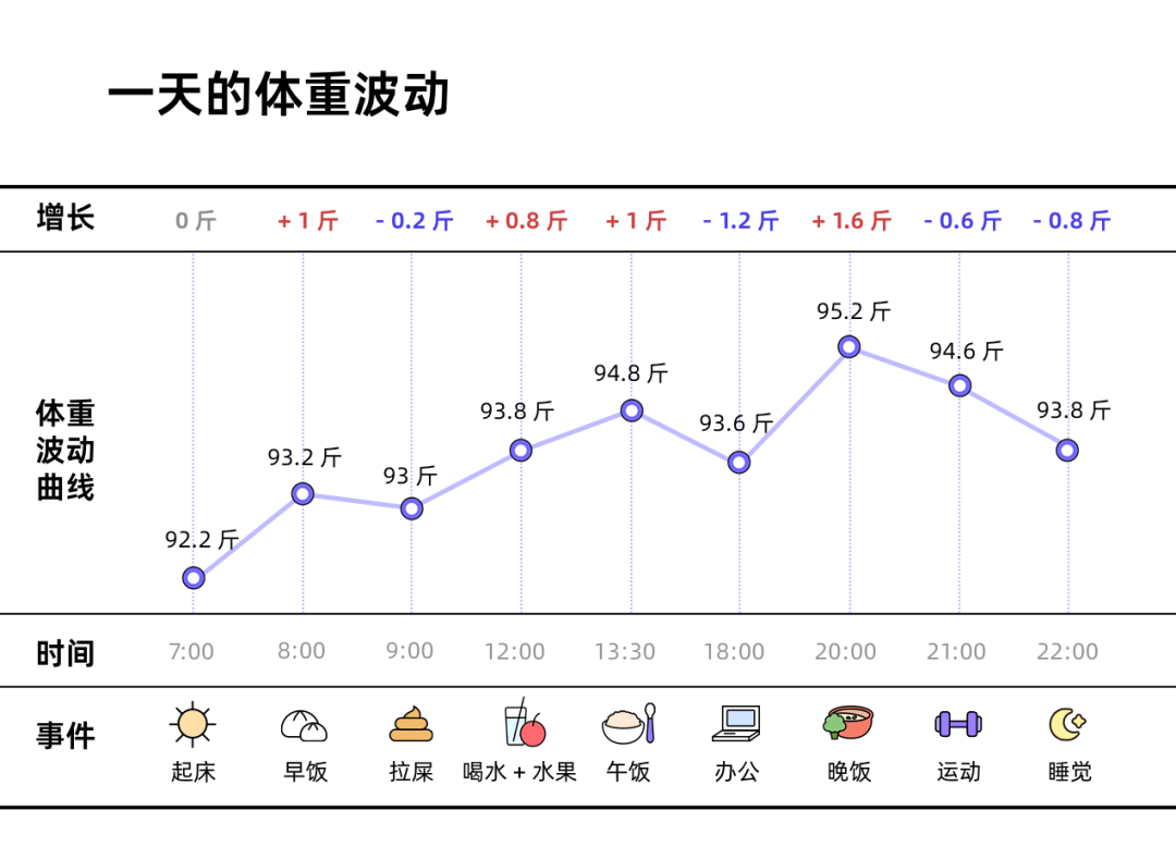 同事阿发亲测,一天的体重波动可以高达 3 斤,起床之后就会受到吃饭、运动,甚至久坐的影响,体重变化巨大。