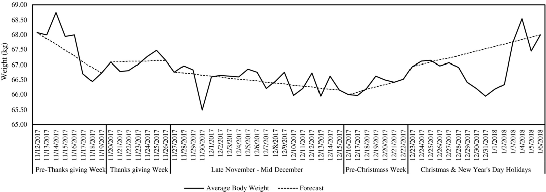 这群人在感恩节周体重下降,而到了圣诞节的时候体重大幅上涨的情况,整体体重保持不变。
