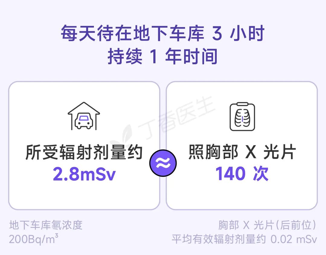 假设地下车库的氡气浓度在 200 Bq/m³ 左右(小区常见中间值),一个人每天在地下车库唱歌或跳舞待 3 个小时,再按照《氡及其子体个人剂量监测方法》中室内工作场所 1.3 x 10-5 mSv/Bq-3·m·h 的系数转换[3],结果发现——