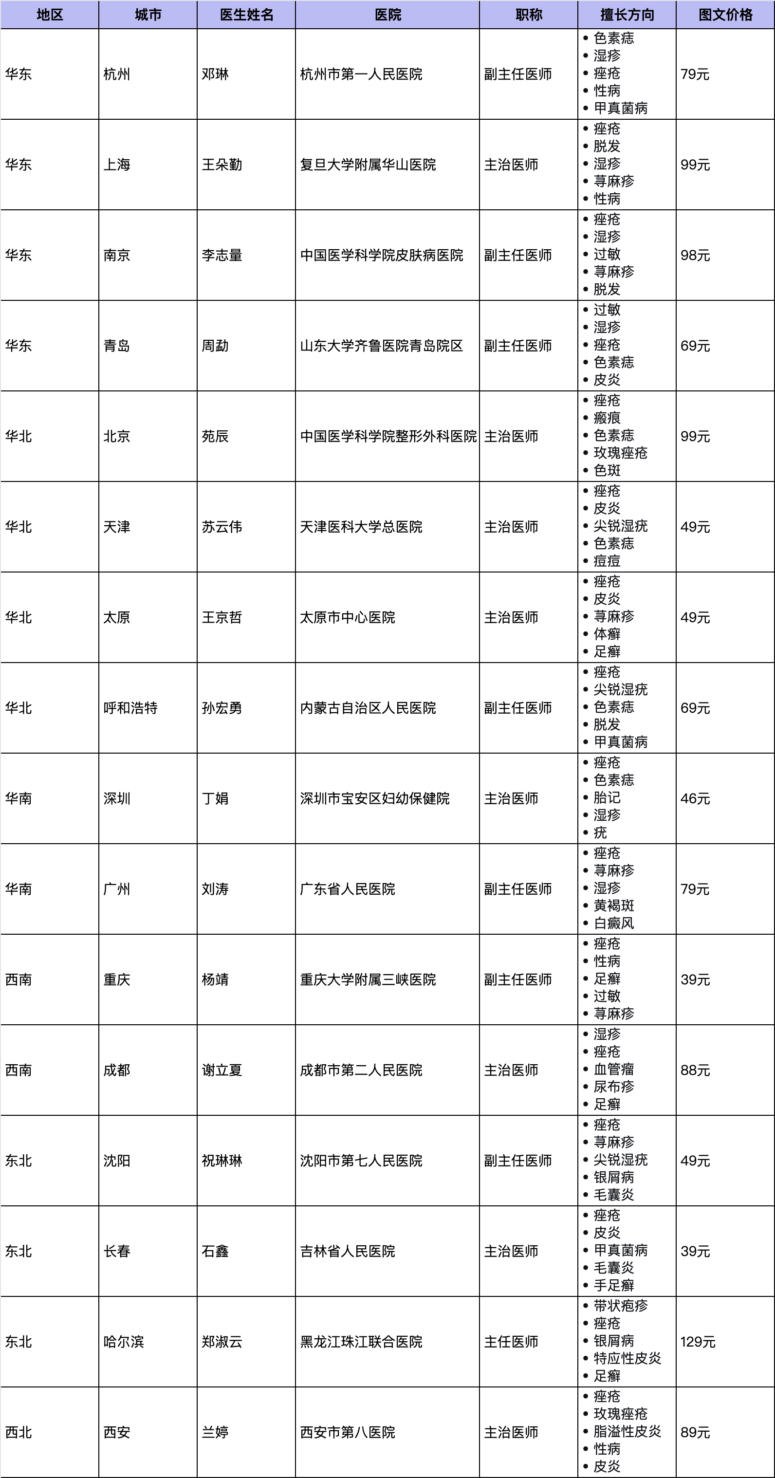 本列表是基于丁香医生问诊用户的真实评价,覆盖华东、华北、华南、东北、西南、西北六大区域 16 个城市的口碑皮肤科推荐,涵盖痘痘、痤疮、湿疹、荨麻疹、脱发、灰指甲、色素痣等常见皮肤方向,仅供大家参考。