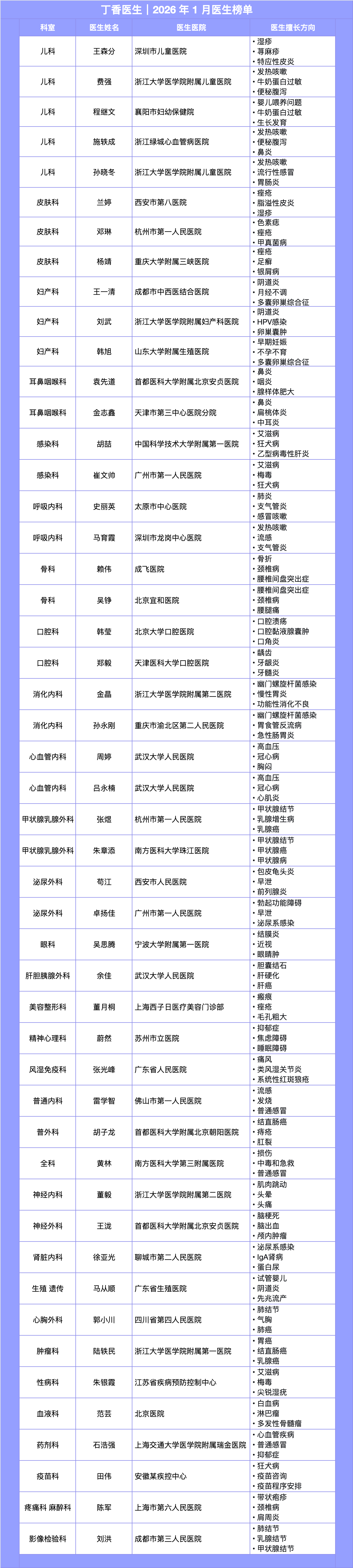为方便您查阅,以下是全部 50 位荣誉上榜医生的基本信息,按科室分类排列: