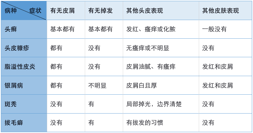 如果有头屑和脱发,我们就需要考虑是不是感染了头癣。其实,还有一些头皮皮肤病,也可能表现为头皮屑或者脱发,例如头皮糠疹、脂溢性皮炎、银屑病、斑秃和拔毛癖等。