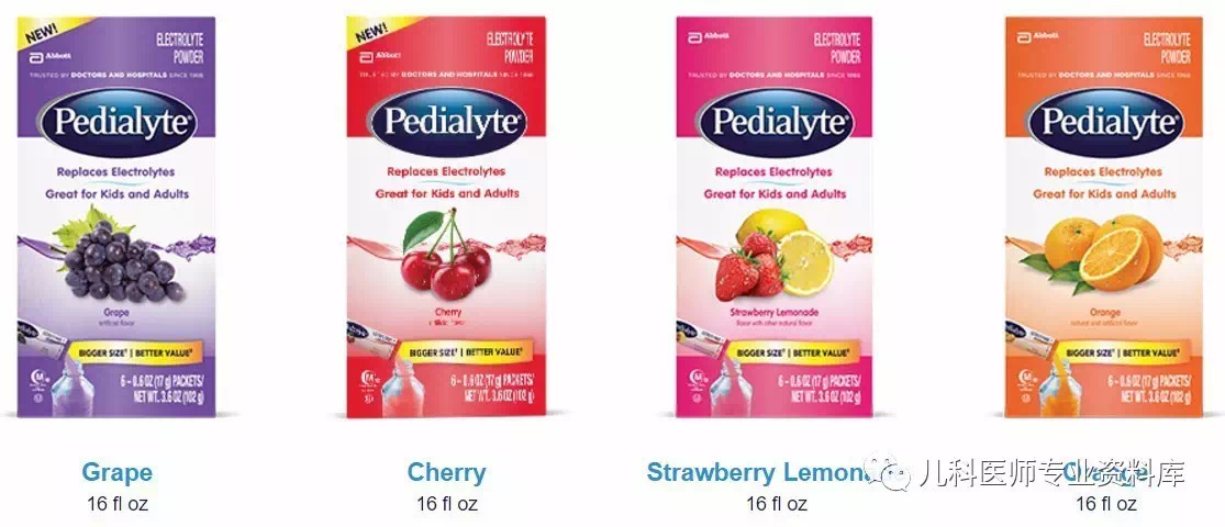 目前认为 ORS~75,在国内也就是 ORS~Ⅲ,是最好的预防和纠正轻中度脱水的药物,可是有个问题是这款口服补液盐有些咸(虽然比上一代的已经淡多了),有些孩子不爱喝,喜欢喝些甜的口服补液盐,怎么办呢?于是被誉为美国销量第一的口服补液产品 —pedialyte 就产生了,这款产品有粉剂的,有液体的,有棒冰的,各种口味的都有,小孩喜欢吃,卖的非常好。并且国内现在代购这款的也很多,那么,这个产品到底如何呢?