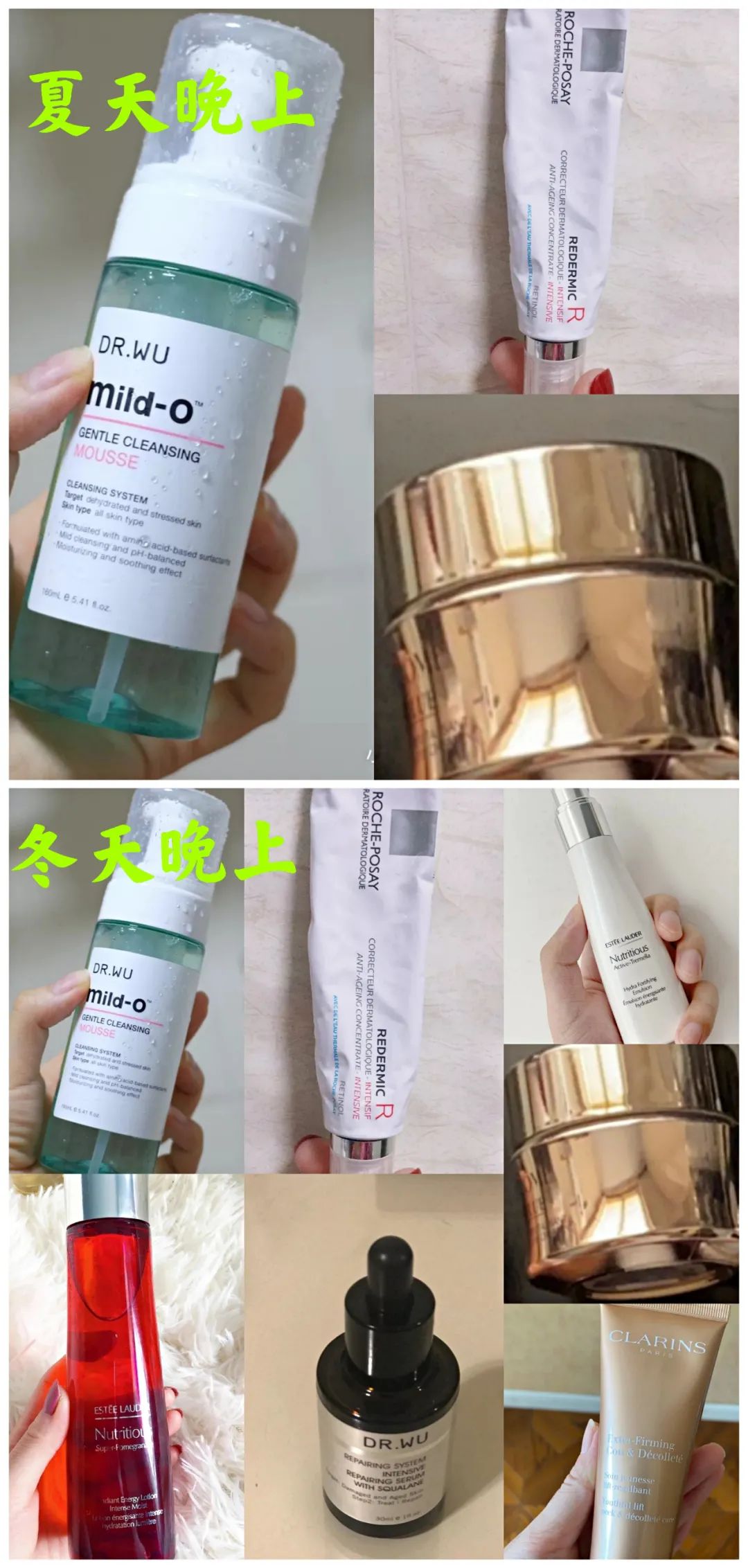 Pm:夏天晚上我也用的很少, dr.wu 洁面泡沫+理肤泉的视黄醇精华+兰蔻菁纯眼霜。冬天晚上多一点, dr.wu 洁面泡沫+雅诗兰黛红石榴水+ dr.wu 角鲨烷油(不一定每次,偶尔很干就会加)+雅诗兰黛天使乳液+兰蔻菁纯眼霜+理肤泉视黄醇精华+娇韵诗的颈霜。