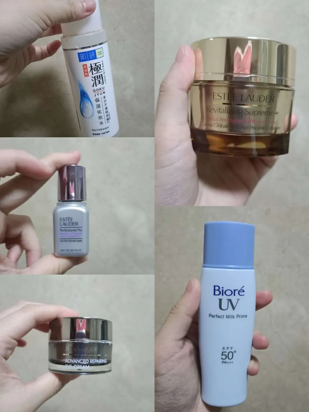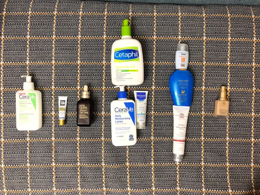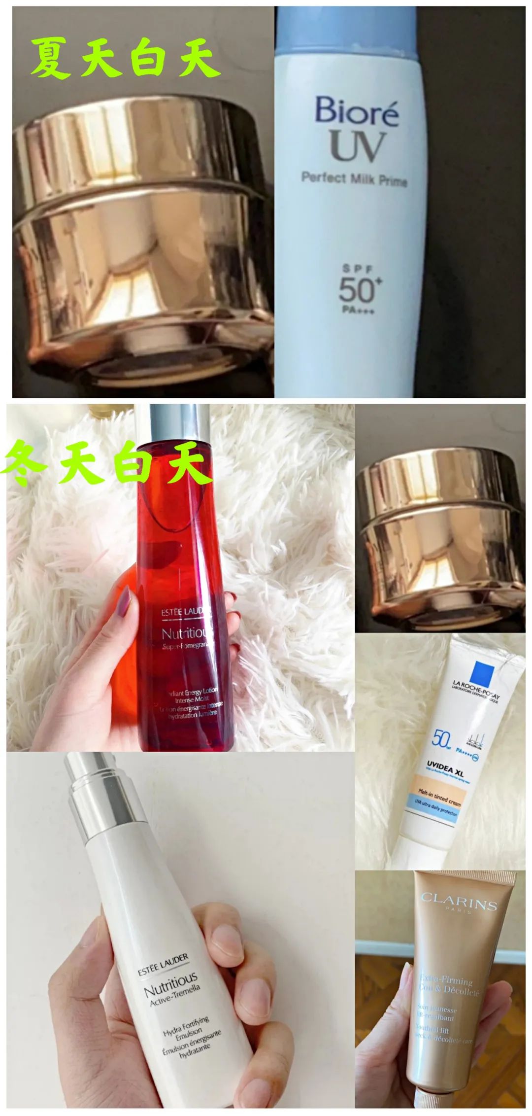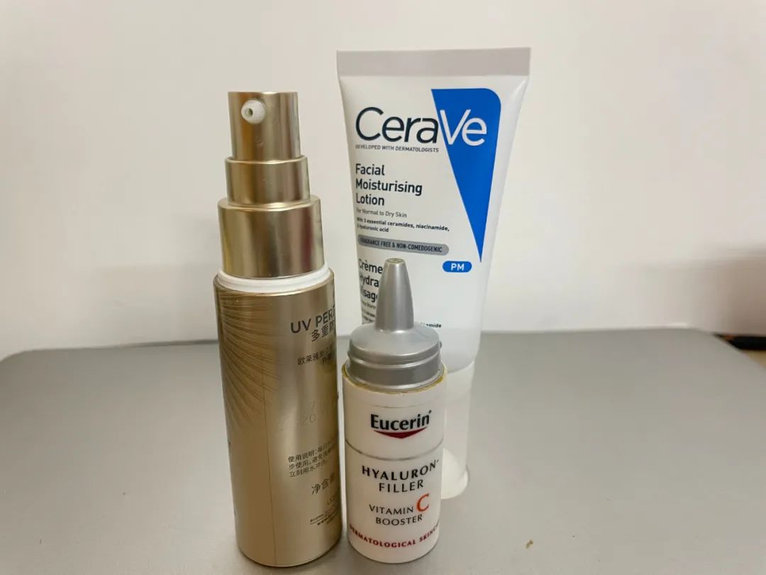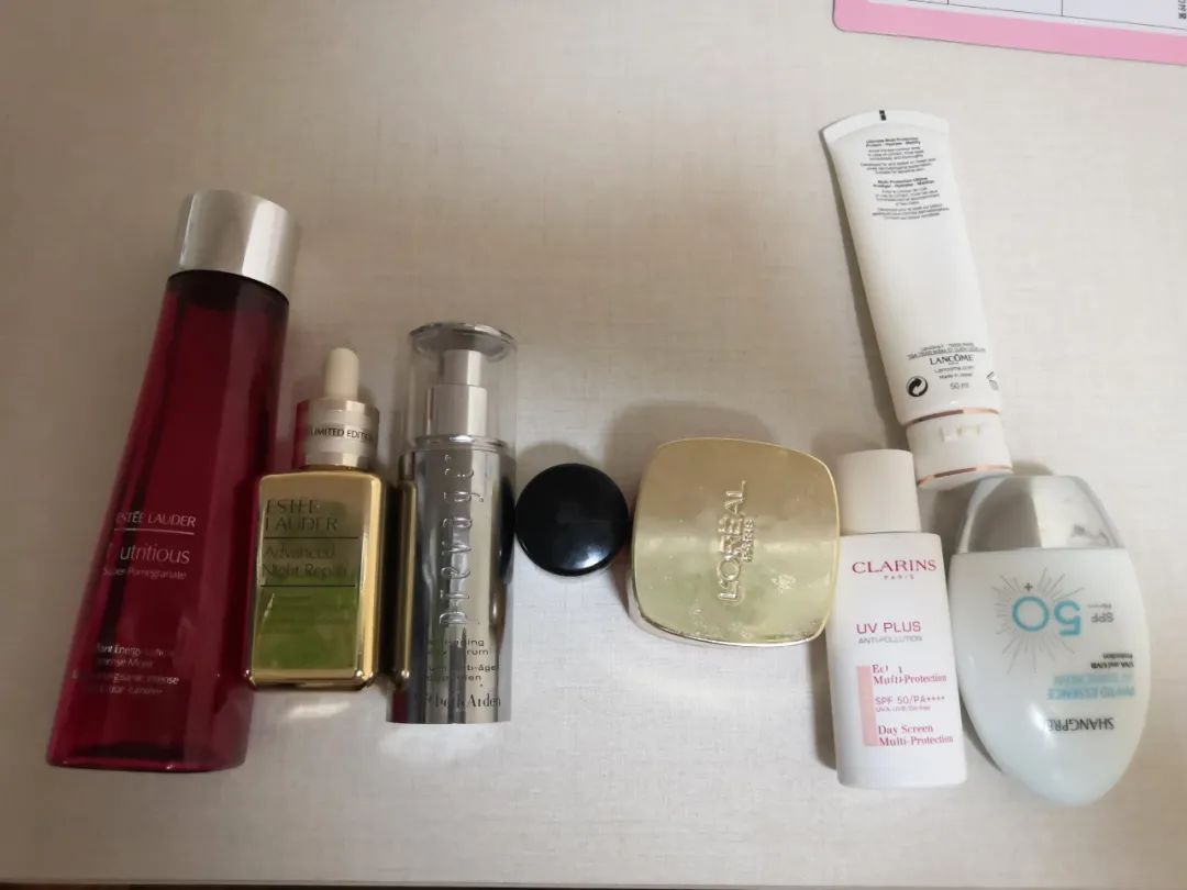 Am:夏天经常出汗,护肤品擦上去没多久就出汗了,所以夏天白天只用兰蔻菁纯的眼霜+碧柔的防晒霜,清水洗脸。冬天会多一点,雅诗兰黛的红石榴水+雅诗兰黛天使乳液+兰蔻菁纯眼霜+理肤泉每日隔离(润色那款)+娇韵诗颈霜