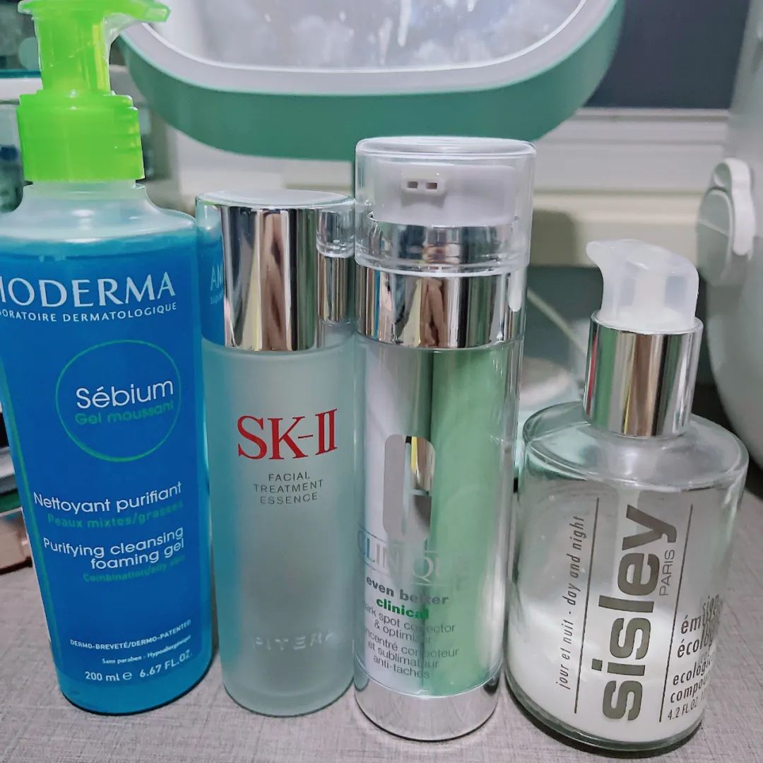 Am:贝德玛净颜平衡洁面、水 skii 、眼霜芯丝翠眼霜、(因为装在携带盒里就没拍照了)精华倩碧双星双效美白淡斑、乳希思黎全能乳、面霜 skii (目前夏天没有使用)
