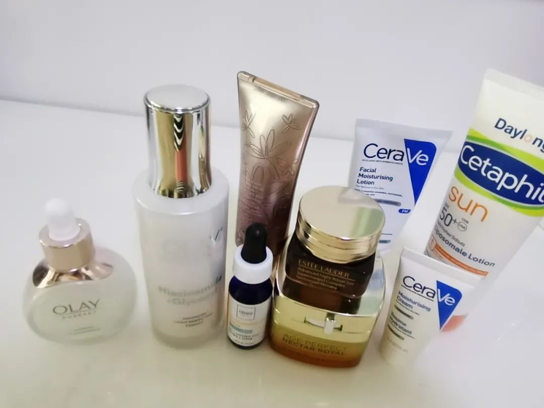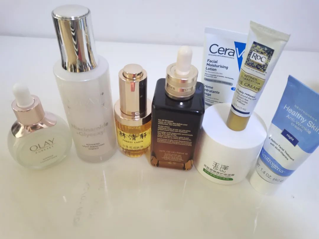 Pm:林清轩平衡洗面奶— OLAY 流光瓶精华— OLAY 抗糖小白瓶—林清轩茶花护肤油—雅诗兰黛小棕瓶— ROC 眼霜—玉泽屏障修护保湿霜。颈部适乐肤 PM 乳—露得清牙膏A醇—适乐肤 C 霜