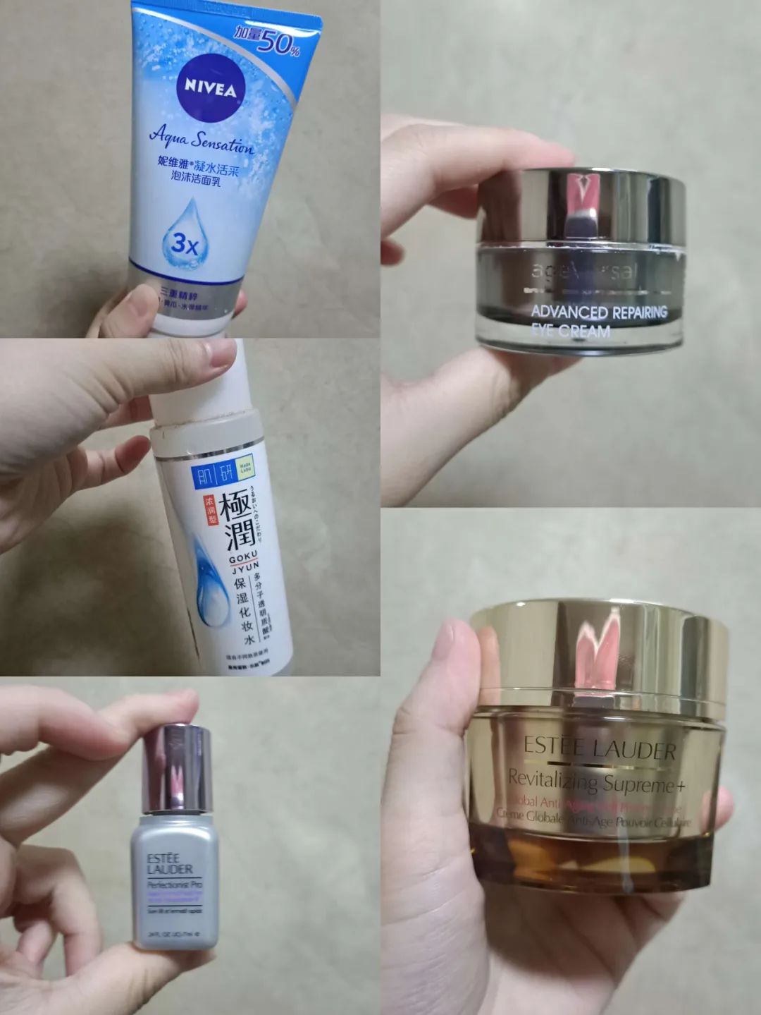 Pm:妮维雅洗面奶,肌研极润化妆水(滋润版),雅诗兰黛线雕精华(或者小棕瓶), Dr.wu 角鲨烷眼霜,雅诗兰黛智妍面霜( cell power 版本)