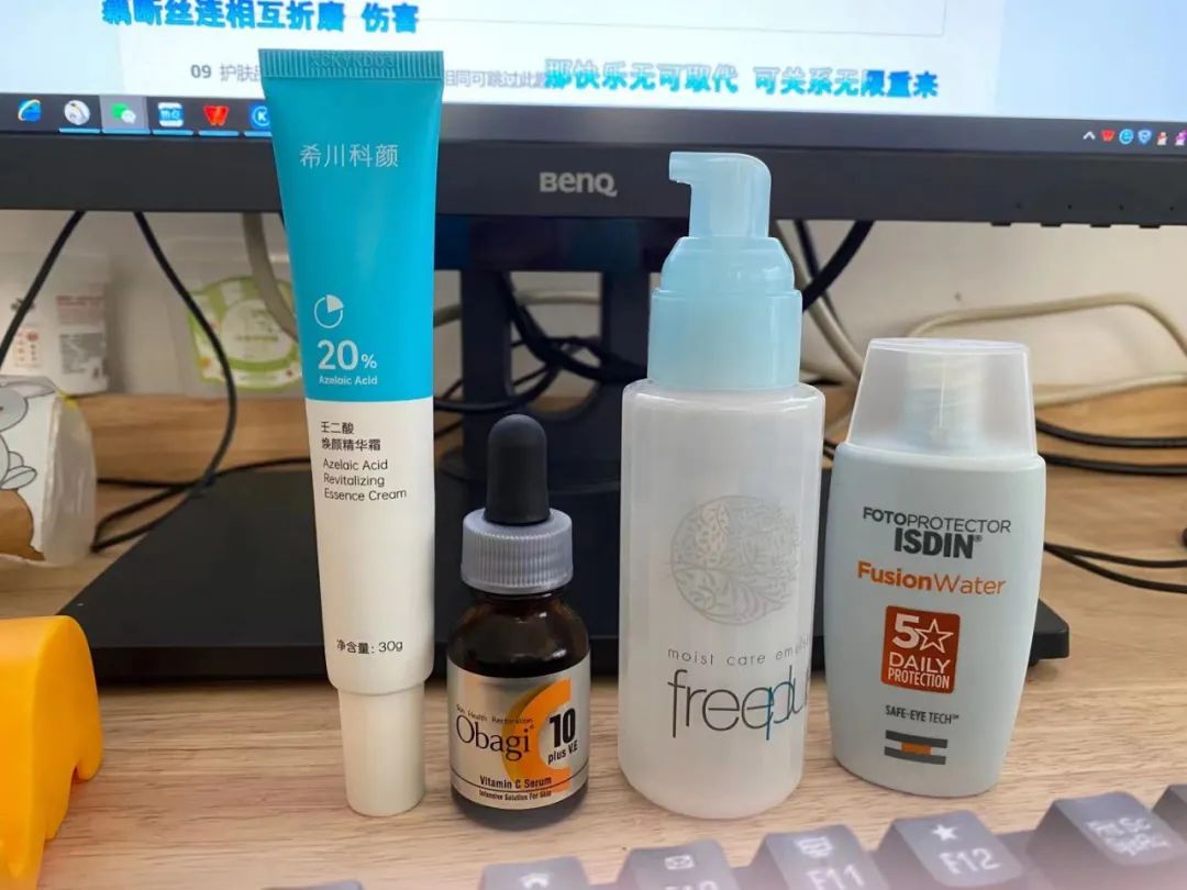 目前的护肤品都问题不大,注意 A 醇产品要用在夜间,白天紫外线作用下会氧化失效。雀斑不要指望护肤品(除了防晒霜),直接光子或者激光治疗,效果很好。