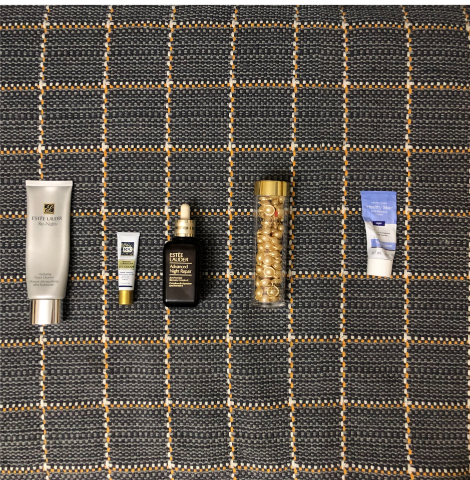 Pm: Dr.wu 洁面泡沫-雅诗兰黛的红石榴水(可省略)-兰蔻菁纯眼霜-理肤泉视黄醇精华/ Obagi 0.5A 醇精华/ PCAskin 0.5A 醇精华/ Topix 5X A 醇精华- Dr.wu 角鲨烷油/纪梵希时光精华油/逐本不染油-雅诗兰黛天使乳液-娇韵诗颈霜