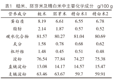 由表格可以知道,胚芽米中的蛋白质、脂肪、灰分、粗纤维等含量均高于精白米;