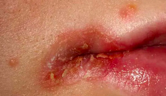 口角处皮肤发红、水肿、潮湿或渗出液体;通常两侧口角对称出现,少数为单侧;可有瘙痒,或张口时有裂痛。