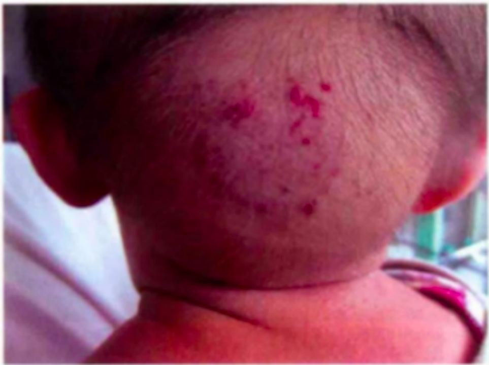 这种情况相对常见。这是一种血管内皮的良性肿瘤,在宝宝的头面部最常见,主要表现为凸起于皮肤表面的鲜红色血管团[2,3]。