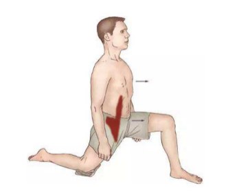 要点:左脚在前,右脚在后成半跪位,双手自然放在身体两侧,或者放在左边膝盖上,然后身体缓慢向前移动,感受右侧髋部前部肌肉的牵伸,避免骨盆旋转,保持 15~30 秒,重复 5~8 次,双侧交替。