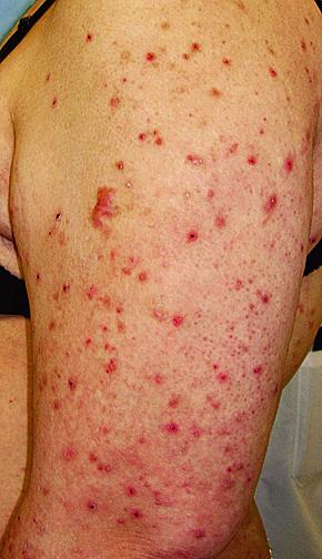 孕妈妈容易因瘙痒而抓挠皮肤,当抓挠后部分皮疹顶部会破溃结痂并持续不退,就可能会出现典型的妊娠痒疹改变,如下图所示。