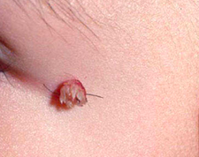 不同于软纤维瘤是软的带蒂(根)的凸起,丝状疣是一种皮肤增生,没有明显的蒂(根)。